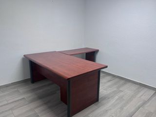 Mesa de despacho en forma de L con un acabado en madera oscura y estructura metálica. - Diseño en L. - Cajonera integrada con tres cajones. - Acabado de madera oscura.