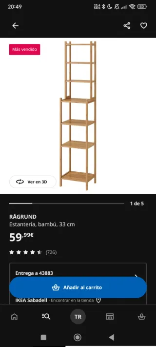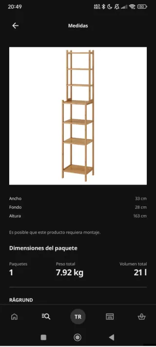 Estantería de bambú de Ikea, modelo RÅGRUND. Sus medidas son 33 cm de ancho, 28 cm de fondo y 163 cm de altura. La entrego montada. Está como nueva porque siempre la hemos usado con protectores