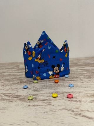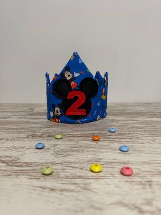 Corona de tela con temática de Mickey Mouse, ideal para celebrar un segundo cumpleaños. El diseño presenta a Mickey y el número 2. - Estampado de Mickey Mouse. - Número 2 en fieltro rojo. - Diseño de corona con puntas.