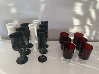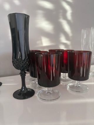 Conjunto de copas de cristal con un diseño elegante. Precio a 1 € la copa si se cogen las 18 a 15€ precio total solo recogida - Copas de color negro. - Copas de color rojo.