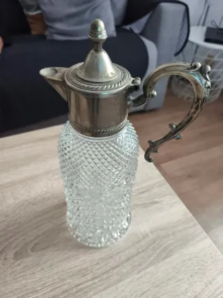 Elegante jarra antigua con cuerpo de cristal tallado y detalles metálicos. Años 1950/1960 SILVERPLATED - Cuerpo de cristal con diseño labrado. - Asa y tapa de metal con ornamentación. - Boquilla para servir.