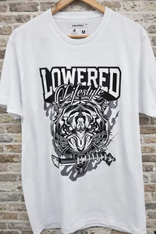 Camiseta blanca con estampado de tigre y texto Lowered Lifestyle. - Diseño frontal con tigre y texto. - Cuello redondo. - Manga corta. - 100% algodón y 190 gramaje Disponible en talla M y L