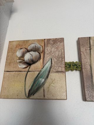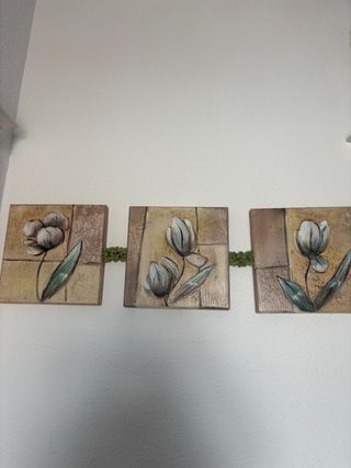 Precioso conjunto de tres cuadros decorativos con motivos florales. - Diseño de flores en tonos beige y verde. - Elaborados en madera.