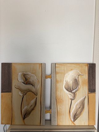Conjunto de dos cuadros decorativos con un diseño de calas en relieve. Cada pieza aporta un toque de elegancia y arte a cualquier espacio. - Pintura al óleo sobre lienzo. - Técnica de relieve para un efecto tridimensional. - Tonos beige y marrón que combinan fácilmente.