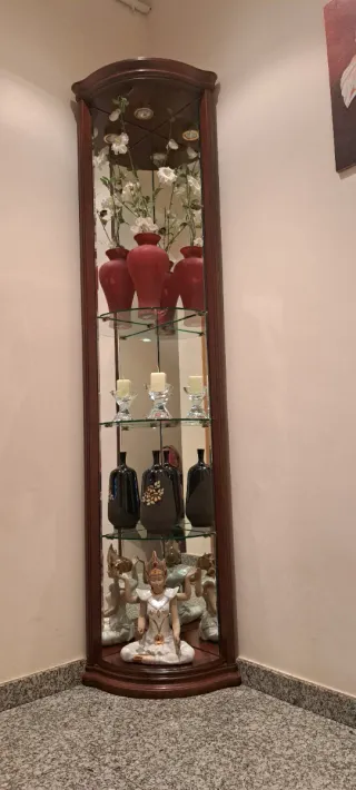 Elegante mueble rinconera con un diseño clásico. - Estructura principal de madera. - Estantes de cristal. - Acabado en tonos marrones