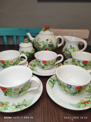 ⚠️NO NEGOCIABLE⚠️ Precioso juego de té vintage con un encantador diseño de fresas y arándanos. - Piezas de cerámica y Porcelana italiana. - Decoración pintada a mano de frutas y flores. - Incluye tetera, azucarero, jarra de leche y 5 tazas con sus platos. MEDIDAS TAZAS: BOCA 10 Cm. ALTURA 7 Cm. ★★SE HACEN ENVIOS POR WALLAPOP★★ GRACIAS. MUEBLES MESAS SILLAS SILLONES SOFAS DECORACION VAJILLA PORCELANA FRANCESA LIMOGES SARREGUEMINES BAVARIA LA CARTUJA DE SEVILLA COPAS VASOS CRISTAL CHINO CERAMICA CHINA JAPONES TENEDORES CUCHILLOS CUCHARAS COLECCION ANTIGUA ANTIGUO RETRO VINTAGE HOME RUSTICO LAMPARA