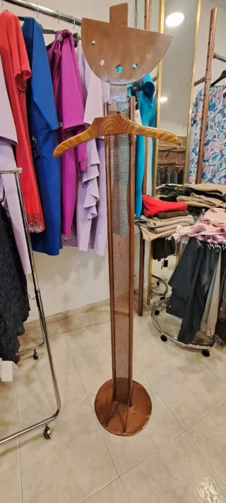 Percha tipo maniquí con estructura de madera y detalles metálicos. - Diseño vertical. - Ideal para exhibir prendas. 4 disponibles Precio unidad. Posible descuento