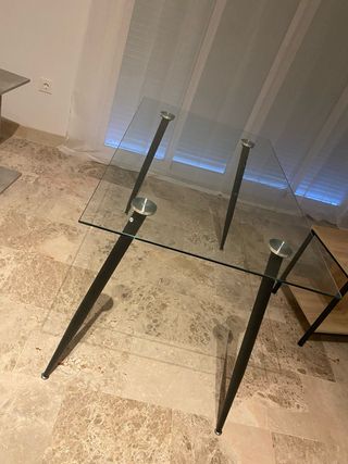Elegante mesa con superficie de cristal y patas metálicas. - Diseño moderno y minimalista. - Patas inclinadas para mayor estabilidad. - Acabado transparente en la tapa.
