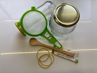 Utensilios para la elaboración del kéfir de leche. Tamaño adecuado para dos personas. Incluye: - Instrucciones sobre todo lo que hay que tener en cuenta antes y durante la elaboración del kéfir de leche (búlgaros después del viaje, desinfección de utensilios, qué cantidad y tipo de leche usar, temperatura, consejos y trucos, paso a paso de la primera y segunda fermentación, precauciones, etc.) - Bote de vidrio para fermentación. - Bote de vidrio para kéfir. - 3 gomas elásticas para sujeción del papel o tela (no incluida) del bote fermentador. - Cuchara de bambú. - Colador de plástico (10cm Ø). #Hacerkéfir, #Kéfirdeleche, #Búlgaros, #Utensilioskéfir, #Elaboraciónkéfir, #Coladorplástico, #Botevidrio, #Cucharamadera.