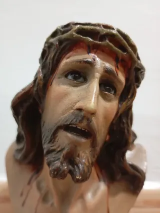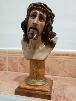 Busto del Cristo de Limpias, una pieza religiosa con gran detalle. - Rosario de madera de regalo. - Representación del rostro del Cristo. - Corona de espinas con detalles de sangre. - Expresión facial conmovedora. - Altura: 18 centímetros. - Ancho: 8 centímetros. - Profundidad: 7 centímetros. - Precio no negociable.