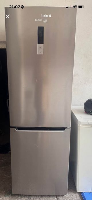 Nevera combi de la marca Fagor con acabado en acero inoxidable. Cuenta con un panel de control digital en la parte frontal. - Diseño moderno. - Panel de control digital.