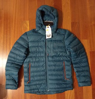 Chaqueta de plumas Forclaz MT500 con capucha para hombre. Bloquea el frío con plumas de 800 CUIN certificado RDS. Resiste hasta -10°C, siendo ultraligero y comprimible. - Color verde azulado. - Diseño acolchado. - 3 bolsillos con cremalleras naranjas. - Incluye bolsa para guardar y transportar. Valorado en 89,99€.