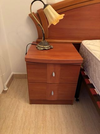 Centro de noche de madera con un diseño elegante y curvo. Incluye dos mesitas de noche a juego con dos cajones cada una y dos lámparas. - Acabado en madera de cerezo. - Mesitas de noche con tiradores metálicos. - Lámparas con pantalla de tela.