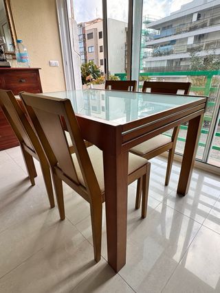 Conjunto de mesa de comedor con superficie de cristal y estructura de madera, acompañado de cuatro sillas. - Mesa con sobre de cristal. - Patas y estructura de las sillas de madera. -se puede extender para 8 personas