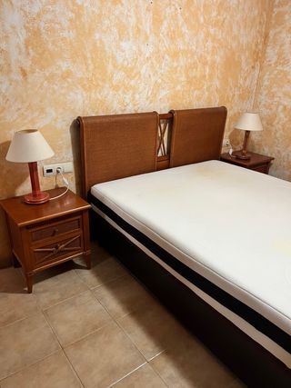 Conjunto de cabecero y dos mesitas de noche a juego. El cabecero tiene un diseño con detalles en madera y el acabado es en ratán. - Cabecero con diseño de listones cruzados. - Mesitas de noche con un cajón y un espacio abierto. - Tiradores de cajón con diseño decorativo. Mesitas de noche: 56cm alto 48cm ancho 42cm profundo