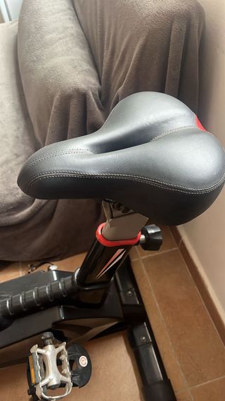 Bicicleta de spinning de la marca WONDERFIT. -Se ha usado muy poco. - Diseño en color negro con detalles en rojo. - Sillín acolchado para mayor comodidad. - Manillar ajustable. - Pantalla digital integrada , no funciona por sulfatación de las pilas al no usarse
