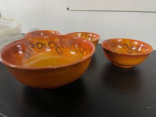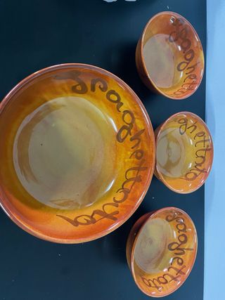 Conjunto de cuatro cuencos de cerámica con un diseño vibrante, perfectos para servir pasta o aperitivos. - Diseño con la palabra Spaghetti escrita a mano. - Tonos cálidos en naranja y marrón. - Ideal para cenas temáticas o uso diario.