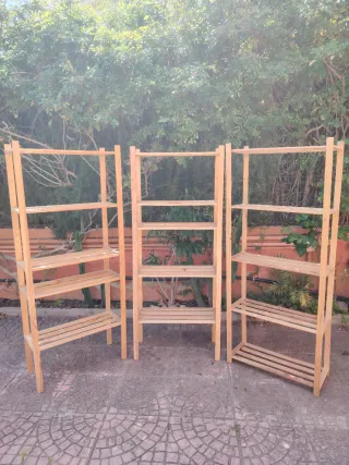 Conjunto de tres estanterías de madera, perfectas para organizar tus espacios. 70 x 170 - Estructura de madera resistente. - Diseño de tres niveles cada una. - Ideal para interior o exterior.