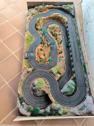 Circuito de Scalextric con paisaje montañoso y vegetación. - Pista de carreras. - Decoración detallada con rocas y palmeras. - Incluye puente y curvas.