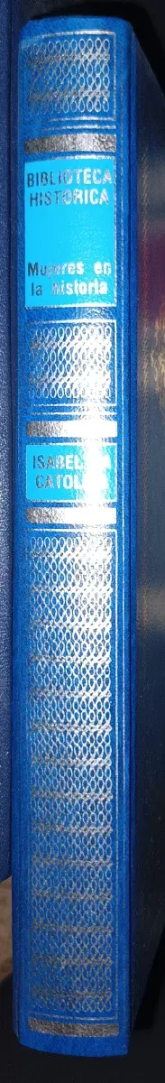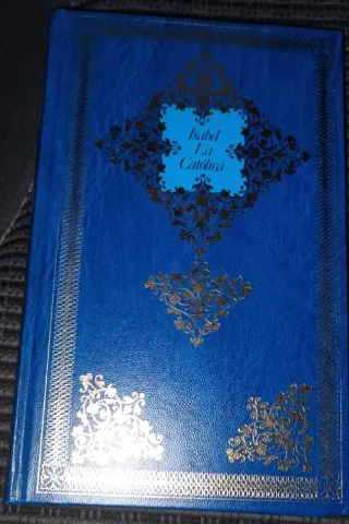 Libro sobre Isabel La Católica. - Cubierta azul con detalles dorados. - Diseño ornamental en la portada.