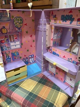 Maleta tocador de Nancy, perfecta para llevar tus accesorios. - Diseño en color lila. - Interior decorado con estrellas y motivos infantiles. - Incluye espejo. - Compartimentos para organizar. - Cajones de diferentes colores. Las luces funcionan y aunque no se ve llevara 4 perchas