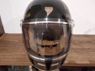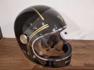 Casco integral de la marca By City en color negro con detalles dorados. Presenta un diseño clásico y elegante. - Talla L. - Doble hebilla. - Acolchados interiores desmontables y lavables. - Calota exterior brillante. - Visera transparente. - Detalles de líneas doradas. - Se vende por falta de uso.