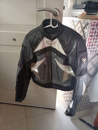 Chaqueta de cuero para moto, ideal para pilotos. - Diseño moderno en negro y gris. - Cierre frontal con cremallera. - Detalles de perforaciones en la tela. Original Leather....UK 42