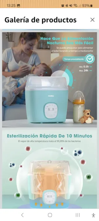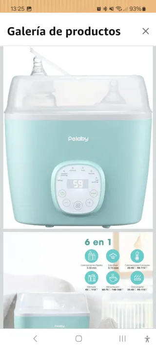 Esterilizador y calentador de biberones de la marca Pelaby, en color azul claro. Este versátil aparato cuenta con múltiples funciones para el cuidado de los más pequeños. - Calentamiento rápido (3-10 min). - Esterilización (5-15 min). - Calentamiento constante (35-45°C). - Calentamiento de fórmula (45°C). - Calentamiento de alimentos (60-75°C). - Descongelación (35-45°C). 6 funciones Calienta Biberones,Calienta Biberones de Alimentos para Bebés,Esterilizador de Vapor,Con Pantalla Táctil LCD, sin BPA, Modo Constante 24H,Ompatible con Cualquier Biberón Una de las tapas tiene una pestaña rota pero eso no afecta su funcionamiento