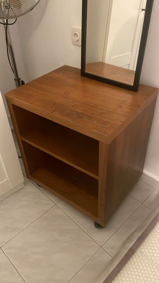🪑 Mueble auxiliar de madera con ruedas Mueble auxiliar muy resistente y funcional. Ideal como mesita de noche, mueble de apoyo, mueble para baño, recibidor o dormitorio. ✔️ Fabricado en madera maciza ✔️ Dos baldas amplias ✔️ Con ruedas, se mueve fácilmente ✔️ Muy estable y duradero ℹ️ Estado: Tiene marcas de uso visibles en la parte superior (ver fotos), puramente estéticas. Estructuralmente está perfecto y sigue siendo muy sólido. 📐 Medidas aproximadas: • Ancho: 60 cm • Fondo: 40 cm • Altura: 60 cm