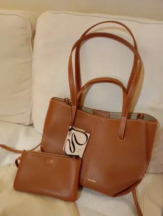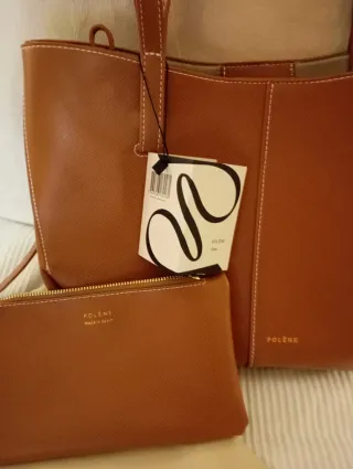 Bolso Polene Cyme en color marrón, con un diseño elegante y moderno. Incluye un neceser a juego. - Material: Piel. - Costuras blancas. - Cierre de cremallera en el neceser. -Nuevo con etiquetas -33x22
