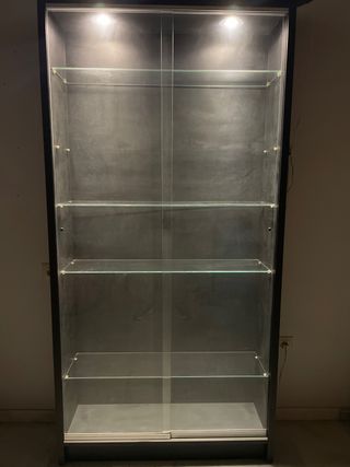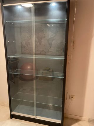 Elegante vitrina con un diseño moderno y minimalista. Perfecta para exhibir tus objetos favoritos. - Estructura principal en color negro. - Balda de cristal. - Puertas correderas de cristal. - Dos focos led
