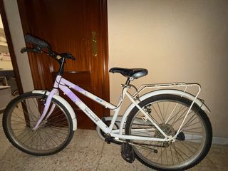 Bicicleta infantil marca Topbike, tamaño 24 pulgadas. Ideal para los más jóvenes. - Cuadro de color blanco con detalles lilas. - Ruedas con llantas de aluminio. - Incluye portabultos trasero. La bicicleta se compró hace años y no ha tenido mantenimiento recientemente. Las gomas de las ruedas no se mantienen infladas: se inflaron en su momento pero se desinflaron al poco tiempo, por lo que probablemente necesiten cambio o revisión (cámaras o cubiertas). Se vende tal cual, ideal para quien quiera hacerle una puesta a punto y aprovechar una buena base de bicicleta.