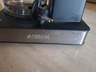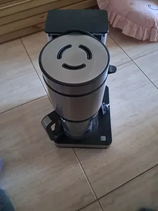 Cafetera de goteo con acabado plateado y base negra. - Jarra de cristal. - Diseño moderno y elegante. - Panel de control frontal.