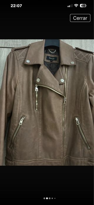 Cazadora estilo motero con acabado en efecto piel. - Cierre principal de cremallera. - Bolsillos frontales con cremallera. - Detalle de cremalleras en los puños. - Cuello solapa con botones a presión. - Hombreras con pespuntes.