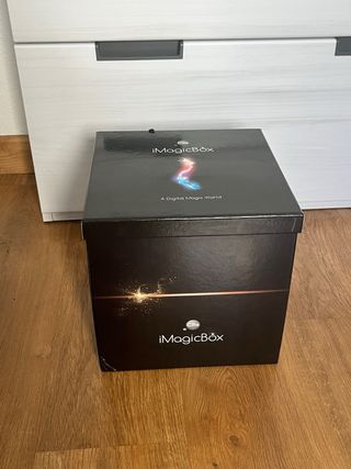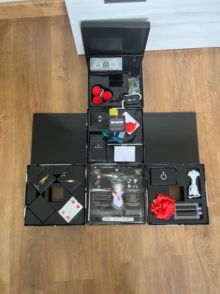 Caja de trucos de magia Imagicbox. - Contiene varios compartimentos con diferentes elementos. - Incluye cartas, pañuelos, bolas rojas y otros accesorios. - Caja principal con tapa abierta. El único desperfecto es que un borde de la caja está un poco roto (penúltima foto)