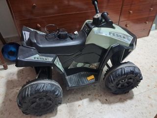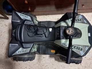 Quad a batería de la marca Feber, diseñado para los más pequeños. Ideal para jugar al aire libre. - Diseño tipo quad con ruedas todoterreno. - Volante para dirección. - Asiento cómodo. - Decoración camuflaje.