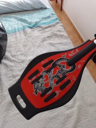 Patineta de dos ruedas con un diseño llamativo de dragón en color rojo y negro. Ideal para deslizarse y divertirse. - Diseño de dragón en ambas tablas. - Color principal rojo con detalles en negro. - Estructura de dos tablas unidas por un eje.
