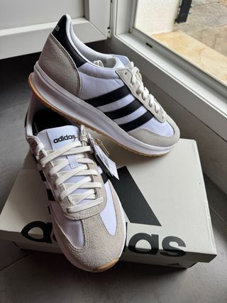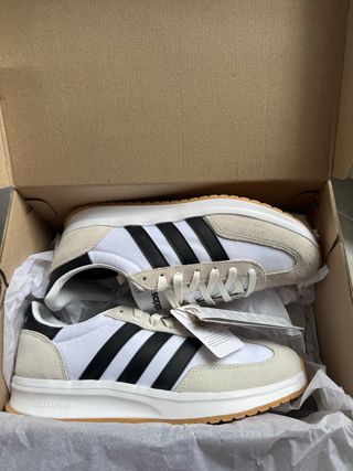 Zapatillas deportivas Adidas con un diseño moderno y cómodo. - Combinación de colores beige y blanco. - Detalle de las icónicas tres rayas negras. - Suela con tecnología Cloudfoam para mayor amortiguación. talla 43 1/3