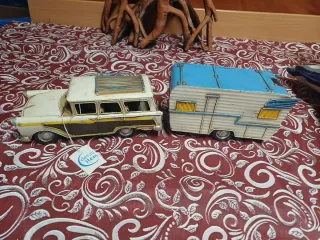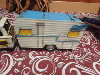 Set de coche y caravana metálicos, ideales para decoración. - Coche de estilo retro en color blanco y marrón. - Caravana con detalles en azul y amarillo. - Fabricados en metal. Miden las 2 piezas juntas unos 50cm de largo y unos 10cm de ancho
