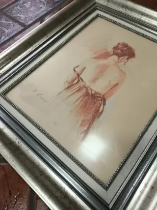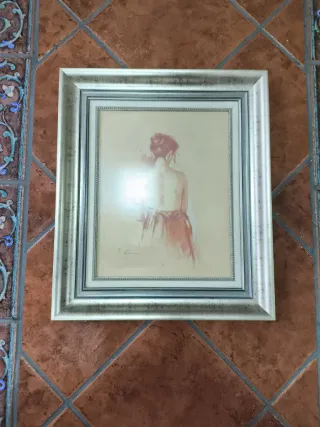 Precioso cuadro con una figura femenina, firmado por el artista. 58 x 50 - Marco de madera con detalles plateados. - Dibujo a carboncillo y acuarela sobre papel.