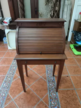 Elegante escritorio de madera maciza con un diseño clásico y funcional. Perfecto para cualquier espacio decorativo y elegante. 1140 x 650 x 450 - Cajón superior con tapa enrollable. - Dos cajones pequeños en la parte superior. - Patas robustas y estables.