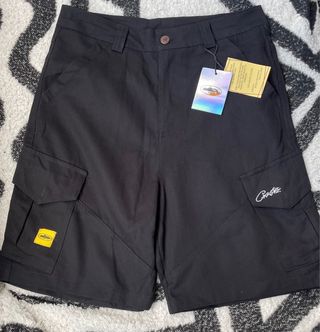 Pantalones cortos de la marca Corteiz en color negro. Cuentan con un diseño moderno y práctico. - Bolsillos cargo. - Etiqueta amarilla distintiva. - Logo bordado en el bolsillo derecho.