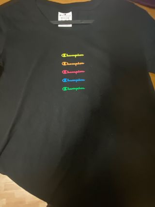 Camiseta deportiva Champion de color negro. Presenta un diseño con el logo de la marca repetido en varios colores. - Logo de Champion en arcoíris. - Cuello redondo.