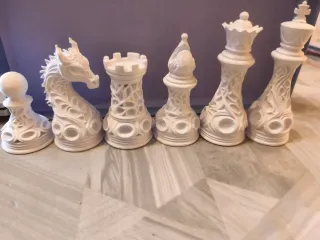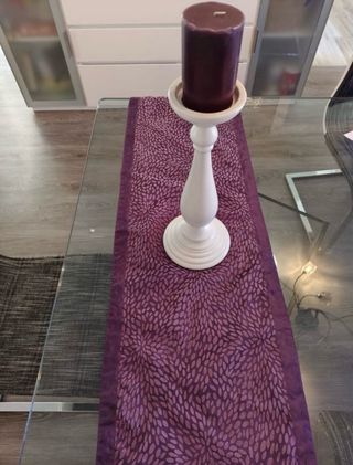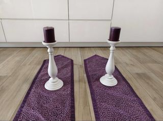 Set de dos candelabros blancos con un diseño elegante. Cada uno está coronado por una vela morada. - Candelabros de plástico. - Velas de color morado.