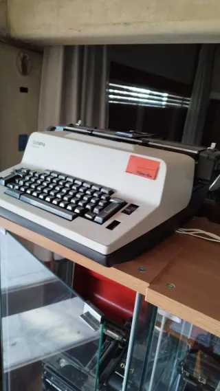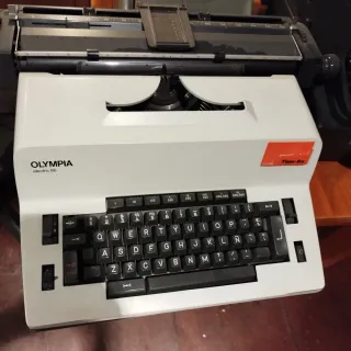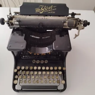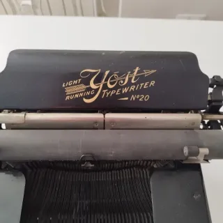 Máquina de escribir Yost N°20 de estilo antiguo. Un objeto clásico para coleccionistas o amantes de la escritura. - Diseño en color negro brillante. - Teclado QWERTY completo. - Marca Yost, modelo N°20.