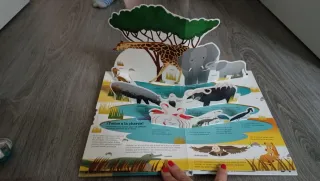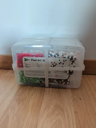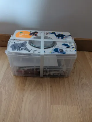 Caja de almacenamiento transparente para manualidades o juegos. - Diseño con temática de dinosaurios y animales. - Incluye cintas elásticas para asegurar la tapa. - Ideal para guardar piezas pequeñas.