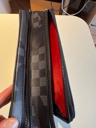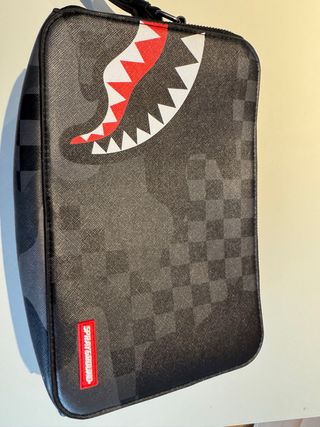 Neceser con un diseño llamativo de tiburón. - Estampado de camuflaje y cuadros. - Detalles en rojo y blanco. - Logo de Sprayground en la parte inferior.