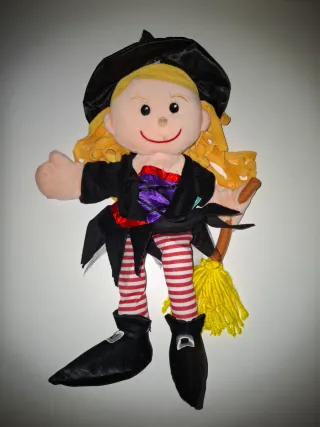 Marioneta de brujita con sombrero negro y escoba. - Vestido negro con detalles morados y rojos. - Calcetines a rayas rojas y blancas. - Zapatos negros puntiagudos. REGALO ALGUNOS ARTICULOS DE MI PERFIL POR COMPRAS DE 10€ MAS JUGUETES , PUZZLES,DISFRACES Y CUENTOS EN MI PERFIL