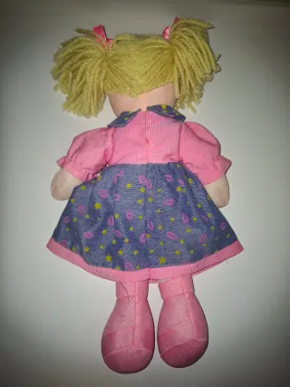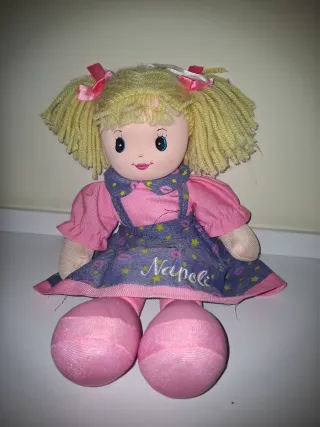 Adorable muñeca de trapo con detalles encantadores. - Pelo rubio recogido en dos coletas con lazos rosas. - Vestido azul con estrellas y nombre Napoli bordado. - Mangas y cuello de vestido en color rosa. - Zapatos grandes y redondos en color rosa. REGALO ALGUNOS ARTICULOS DE MI PERFIL POR COMPRAS DE 10€ MAS JUGUETES , PUZZLES,DISFRACES Y CUENTOS EN MI PERFIL