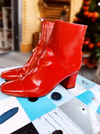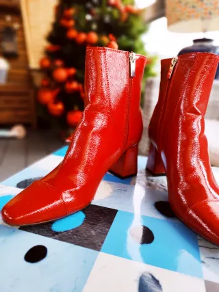 Botines de charol con un llamativo color rojo y un diseño moderno. - Tacón cuadrado. - Punta cuadrada. Sólo una puesta. Ideales para Navidad